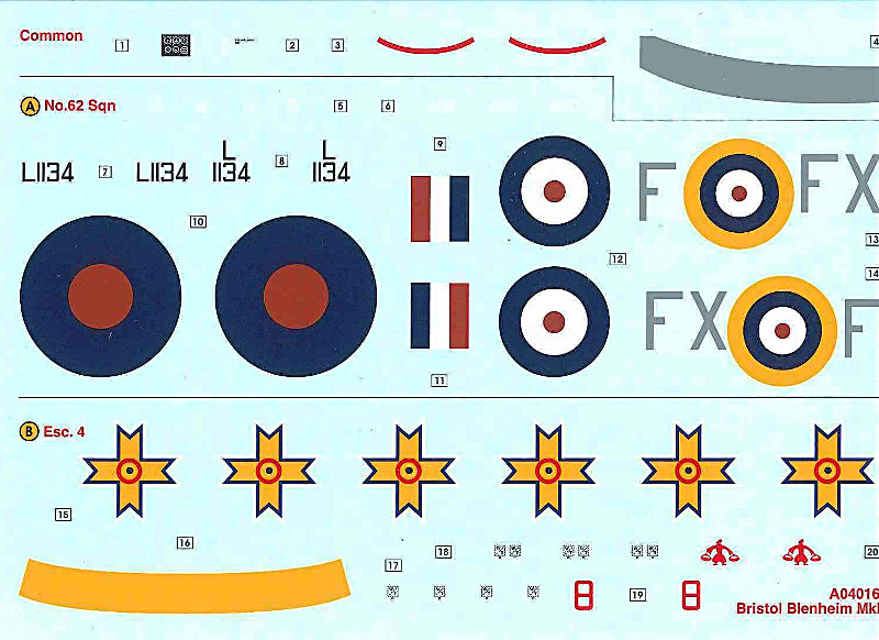 Die Decals sind sauber und versatzfrei gedruckt und erlauben den Bau eines Flugzeuges der RAF und eines der rumänischen Luftwaffe von 1941. Hier hat AIRFIX auch den einzigen kleinen Fehler begannen, der sowohl auf den Karton als auch im Bauplan steht, denn AIRFIX schreibt 1940, statt 1941. Die Andreaskreuze wurden jedoch erst 1941 eingeführt, davor flogen die rumänischen Bristol Blenheim Mk.I mit Kokaden.