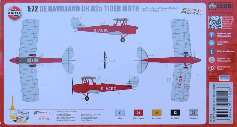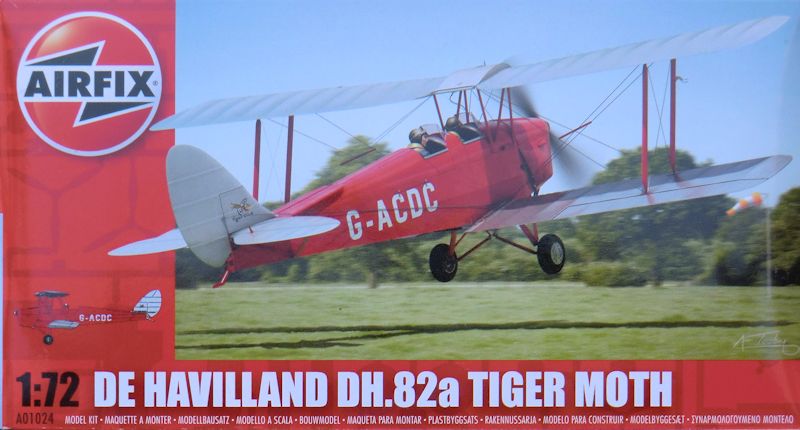 Bausatz: Die DH. 82 ist aus neuen Formen und die erste Neuheit in 1/72 von Airfix im Jahr 2014. Dieser Bausatz präsentiert sich in einer stabilen attraktiven aber unpraktischen Schüttbox. Daran befinden sich gut verpackt drei hellgrau Spritzlinge mit insgesamt 39 Teilen, zwei Klarsichtteile, ein kleiner Decalbogen und die gut gemachte informative Bauanleitung. Dort findet man auch einen ausführlichen Plan zu Verspannung des Modells.