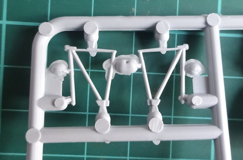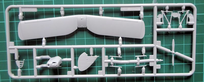Das einteilige Rumpfvorderteil (Motorhaube sieht einfach gut aus. Die ebenfalls einteilige untere und obere Tragfläche gibt die Pfeilung sehr gut wieder. Das gilt auch für die Stoffstruktur und die scharfen Hinterkanten. Von gleicher Qualität sind Höhen- und Seitenleitwerk. Die äußeren Tragflächenstreben können durch ein nach dem Verkleben zu entfernendes Montagekreuz in der richtigen Position befestigt werden. Eine gute Idee. Leider gibt es auch etwas Grat.