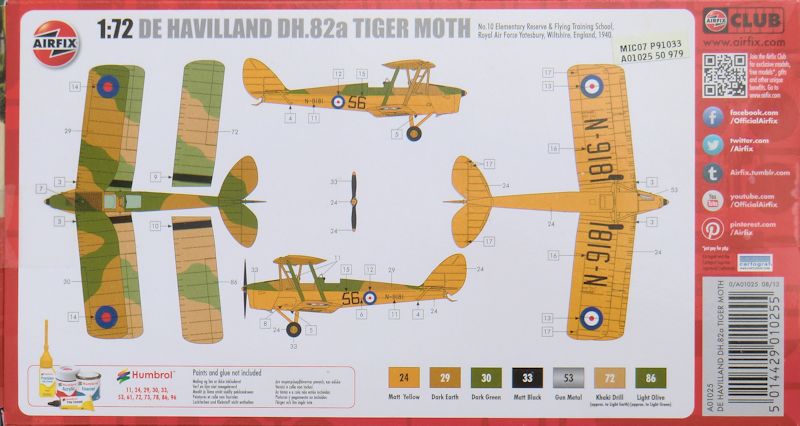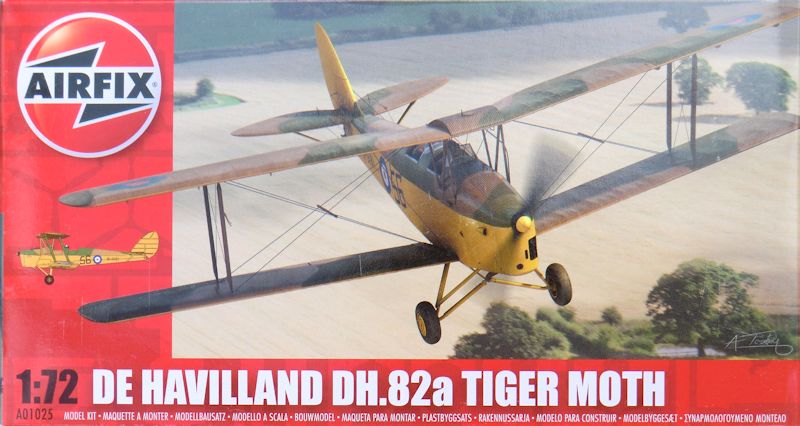 Bausatz: Die DH. 82a ist aus neuen Formen und die war eine erste Neuheit in 1/72 von Airfix im Jahr 2014. Es gibt in gleicher Aufmachung auch eine zivilie Version der DH. 82a. Dieser Bausatz präsentiert sich in einer stabilen attraktiven aber unpraktischen Schüttbox. Daran befinden sich gut verpackt drei hellgrau Spritzlinge mit insgesamt 39 Teilen, zwei Klarsichtteile, ein kleiner Decalbogen und die gut gemachte informative Bauanleitung. Dort findet man auch einen ausführlichen Plan zu Verspannung des Modells.