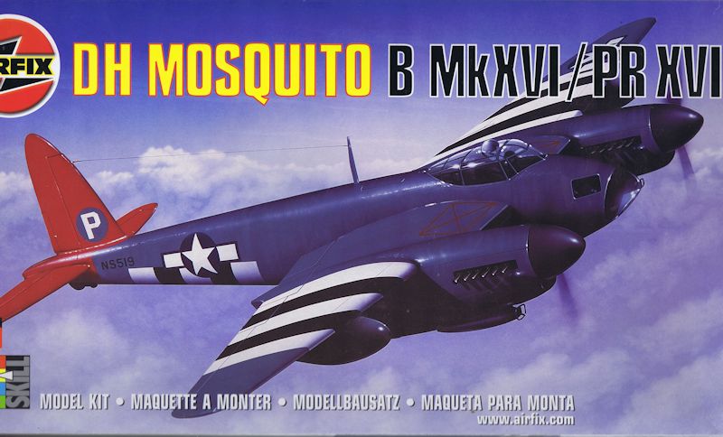 Bausatz: Airfix bot 2003 mit diesem Bausatz eine späte Variante der bekannten D.H. Mosquito an. Basierend auf der Form von 1977 wurden diverse Teile geändert, bzw. hinzugefügt, um das Baumuster Mk. XVI zu realisieren. Im großen Stülpkarton, mit einem schönen Deckelbild einer Mossie im Flug, befinden sich sechs große graue Spritzgussrahmen, sowie zwei kleinere mit Klarglasteilen, ebenso die Bauanleitung und der Decalbogen.