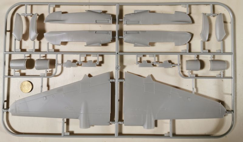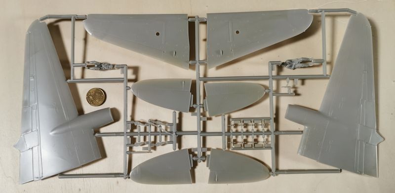 Tragflächen und Leitwerke bestehen aus einer Ober- und Unterhälfte. Sämtliche Ruder sind leider fest angegossen. Man wird also nicht umhin kommen die Säge anzusetzen, will man die Ruderstellung ändern. Des Weiteren sind Panellines, Verschlüsse etc. wie damals üblich erhaben ausgeführt. Auch hier muss man entscheiden, ob man alles runterschleift, und neu graviert. Was auch ein wenig Arbeit macht, sind die stellenweise vorhandenen Sinkstellen. Die sollten auf jeden Fall verspachtelt werden.