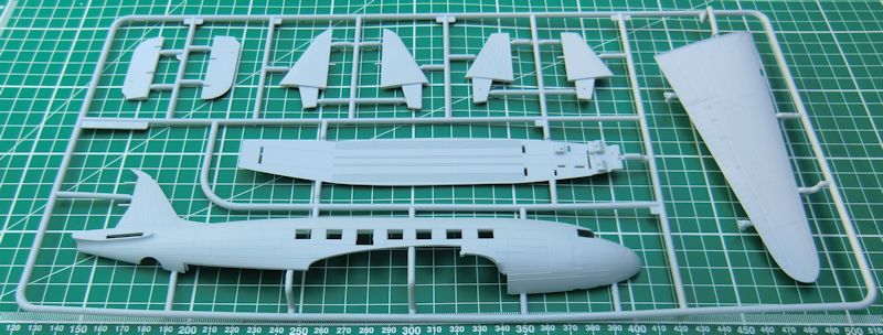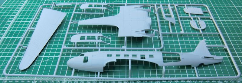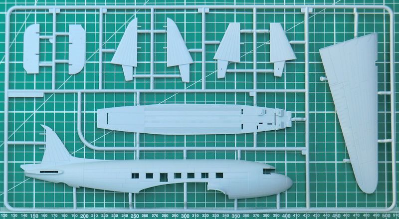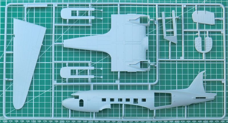 Der Bau der Dakota beginnt mit dem Innenraum und dem Cockpit. Hier gibt es eine komplette Inneneinrichtung. Wer will, der kann zwei Piloten ins Cockpit setzen oder Gurte für die Besatzung und die Passagiere einbauen. Fürs Instrumentenbrett gibt es ein Decal. Alle Türen können alternativ geöffnet angeklebt werden. Alle Klarsichtteile werden von außen angeklebt. Die Tragflächenunterseite wird mit einem stabilen Holm versehen. Ansonsten gibt es Ober- und Unterseiten. Höhen- und Seitenruder werden separat angebaut und bleiben beweglich. Sie haben scharfe Hinterkanten.