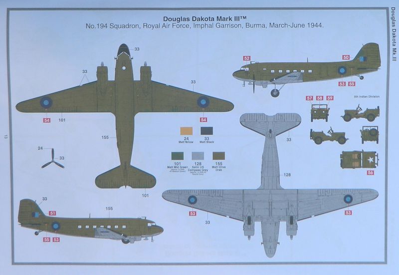 Bausatz: 2014 erschienen bei Airfix die neue DC-3/C-47 und der Willys Jeep in 1/72. Beide erwiesen sich als gelungen und sind voll auf der Höhe der Zeit. Nun gab es eine Kombination. In dem attraktiven praktischen Stülpkarton befinden sich gut verpackt für die Dakota fünf hellgraue Spritzlinge mit 114 Einzelteilen, ein Klarsichtrahmen mit 19 Teilen und für den Jeep zwei hellgraue Spritzlinge mit 72 Einzelteilen, ein Klarsichtrahmen mit zwei Teilen sowie ein Decalbogen, die mehrfarbige Bau- und Bemalungsanleitung. Die Bauteile sind voll auf der Höhe der Zeit und es gibt auch feinste Bauteile. Dazu zählen u.a. diverse Antennen.