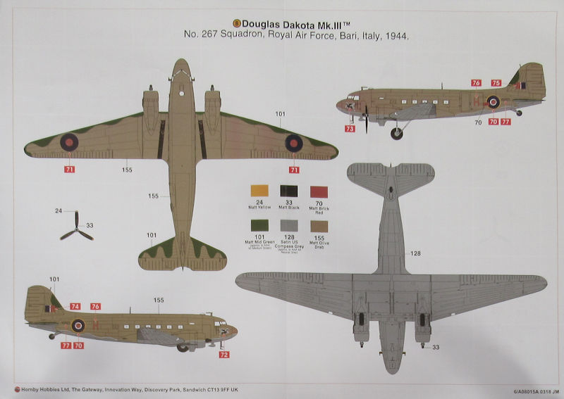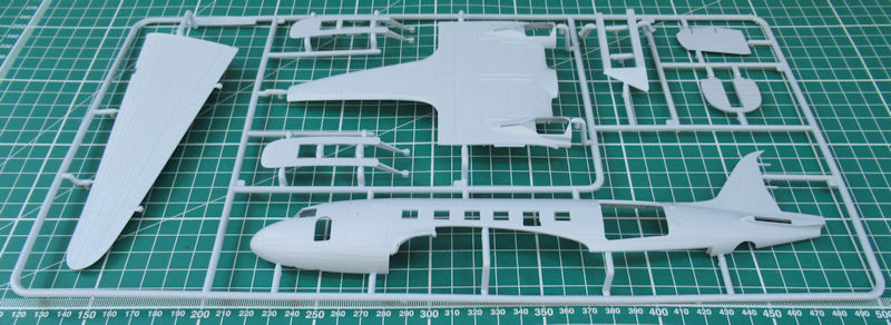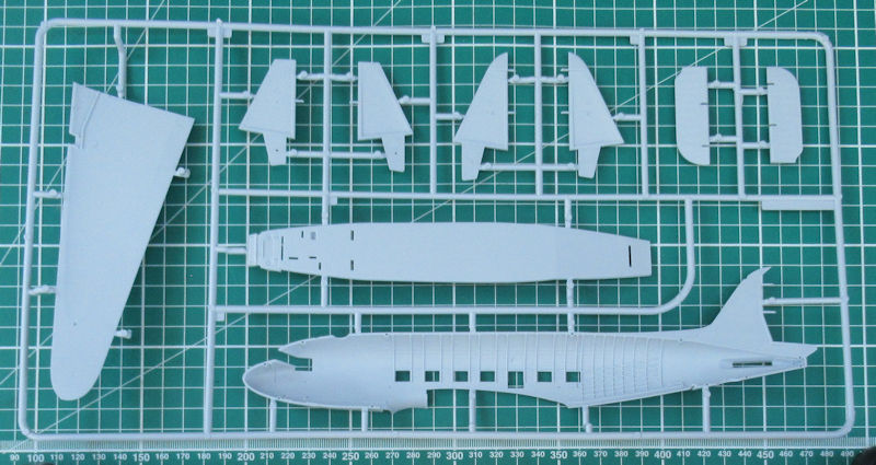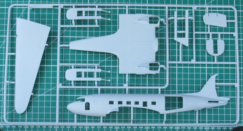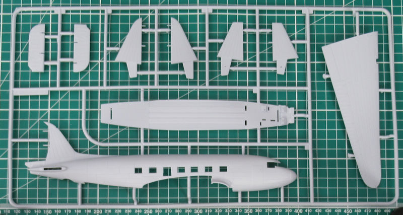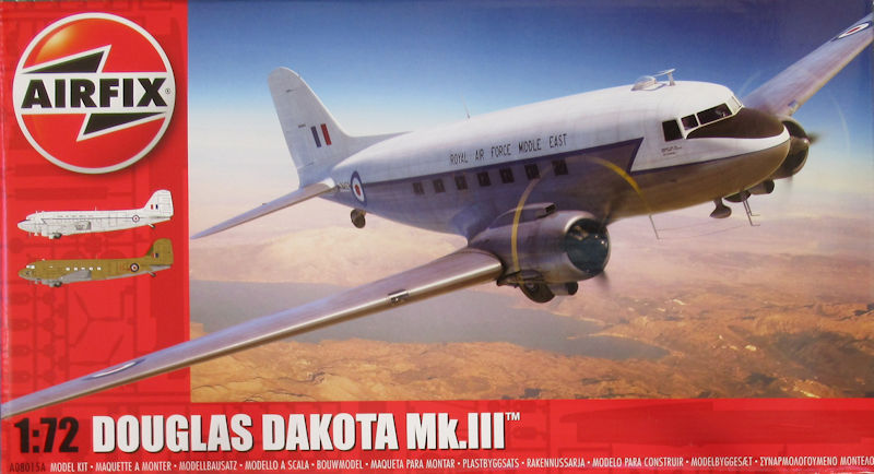 Bausatz: 2014 erschien bei Airfix die neue DC-3/C-47 in 1/72. Diese erwies sich als gelungen und sind voll auf der Höhe der Zeit. In dem attraktiven praktischen Stülpkarton befinden sich bei dieser Wiederauflage gut verpackt für die Dakota Mk. III fünf hellgraue Spritzlinge mit 114 Einzelteilen, ein Klarsichtrahmen mit 19 Teilen, ein Decalbogen, die mehrfarbige Bau- und Bemalungsanleitung. Die Bauteile sind voll auf der Höhe der Zeit und es gibt auch feinste Bauteile. Dazu zählen u.a. diverse Antennen.