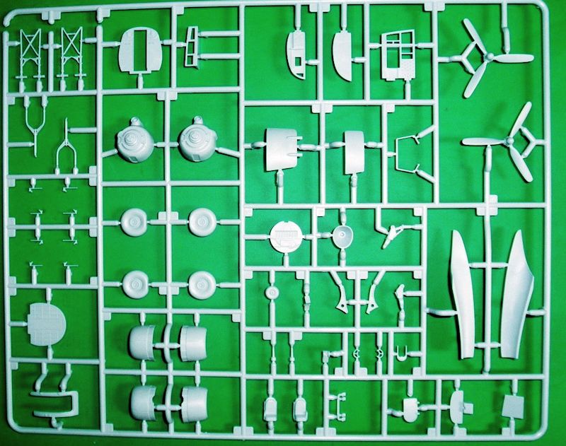 Die Rumpfschalen haben auch innen Spanten, dies ist besonders für Dioramenbauer interessant, da auch eine Laderampe beiliegt und man somit die große Ladeluke auch im geöffneten Zustand darstellen kann. Für den Frachtraum und den Cockpitbereich liegt eine lange Bodenplatte bei. Die Türen können wahlweise geöffnet oder geschlossen dargestellt werden. Das Cockpit ist mit Trennwand, zwei Pilotensitzen, Pedalen, Armaturenbrett und Steuerknüppeln gut ausgestattet, denn durch die relativ kleine Cockpitverglasung erkennt man auch nicht mehr. Die Motoren sind selbstverständlich als Doppelstern dargestellt und auch zwei Arten von Luftschrauben liegen bei. Das Fahrwerk ist detailliert wieder gegeben und die Reifen mit gutem feinem Profil liegen abgeflacht bei. Die Klarsichtteile sind durchsichtig und nicht zu dick.