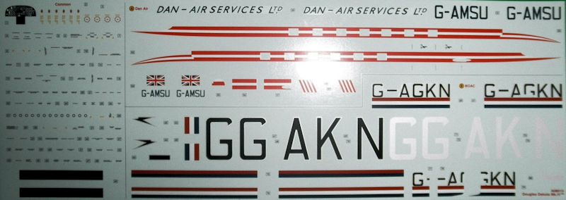 Der Decalbogen ist versatzfrei auf blauem Papier gedruckt und enthält alle Wartungshinweise und erlaubt den Bau einer C-47 des DAN AIRSERVICES und einer abgetarnten C-47 der BOAC.