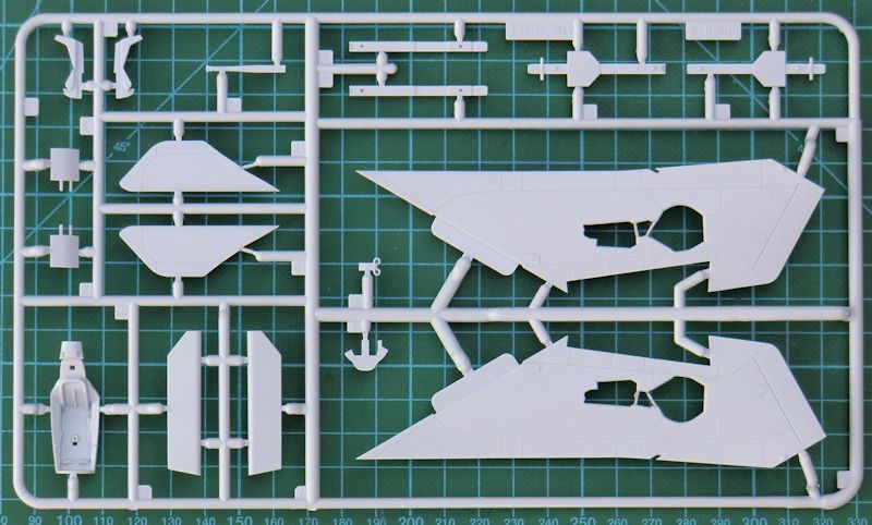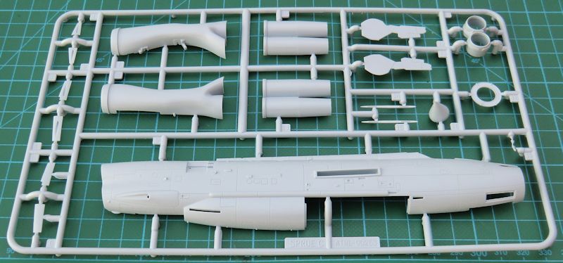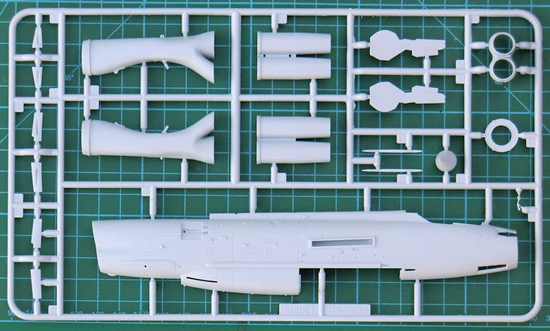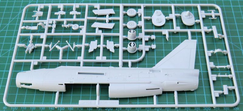 In dem stabilen praktischen Stülpkarton befinden sich gut verpackt vier hellgraue Spritzlinge mit 85 Teilen, ein kleiner Klarsichtrahmen mit sieben Teilen, ein großer Decalbogen und die mehrfarbigen Bemalungsanleitung in der übersichtlichen Bauanleitung. In letzterer hat sich als Pilot offensichtlich jemand verewigt. Die Bauteile haben feine versenkte Strukuren und es gibt keinen sichtbaren Grat. Das Cockpit ist recht einfach. Obwohl der Schleudersitz aus vier Teilen entsteht wirkt er etwas einfach. Das lässt sich durch den Piloten kaschieren. Die Instrumente werden mittels Decals dargestellt.