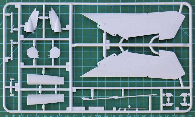 Der Lufteinlauf ist toll gemacht und sehr tief. Im Konus sollen 4 Gramm Gegengewicht untergebracht werden. Im Heck wirkt es sehr stimmig. Hier sind schon aus der Kiste die Triebwerksauslässe recht ordentlich. Sicher geht es in Resin besser. Für die meisten Modellbauer reicht es. Bei den Tragflächen bin ich ein wenig enttäuscht. Hier hätte ich mir einteilige scharfe Hinterkanten gewünscht. Immerhin bestehen die Landeklappen aus einem Stück. Diese können optional in abgesenkter Position montiert werden. Dafür ist das Seitenleitwerk an eine Rumpfhälfte anmodelliert und auch die beiden Hälften des Pendelhöhenleitwerks sind einteilig. Die Stabilisierungsflossen unterm Heck sind recht dünn und werden einzeln angeklebt.
