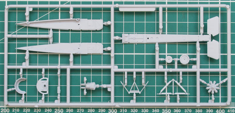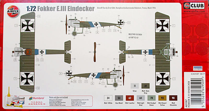 Bausatz: Airfix hatte 2016 den neuen Bausatz der Fokker E.II im Maßstab 1/72 herausgebracht. Kürzlich gab es eine neue E.III aus gleichem Hause. In der attraktiven aber unpraktischen Schüttbox befinden sich gut verpackt zwei hellgraue Spritzlinge mit 35 Teilen, ein Decalbogen und die mehrfarbige Bau- und Bemalungsanleitung. Die Teile sind im übrigen identisch mit denen der E.II.