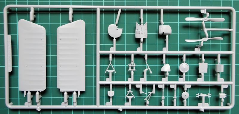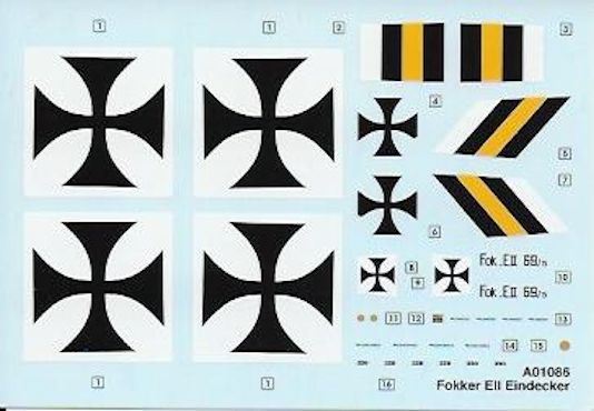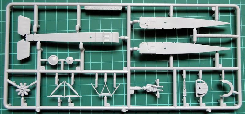 Bausatz: Der Fokker-Eindecker aus neuen Formen besteht aus 35 Einzelteilen. Diese befinden sich an zwei grauen Spritzlingen. Die Rumpfunterseite ist ein Stück, daher ist die Naht am Boden, die bei älteren Bausätzen selbst graviert werden mußte, bereits vorhanden. An diesem Teil wurde das Höhenleitwerk fest angegossen. Das Cockpit ist für einen Bausatz diese Schwierigkeitsgrades gut detailliert.