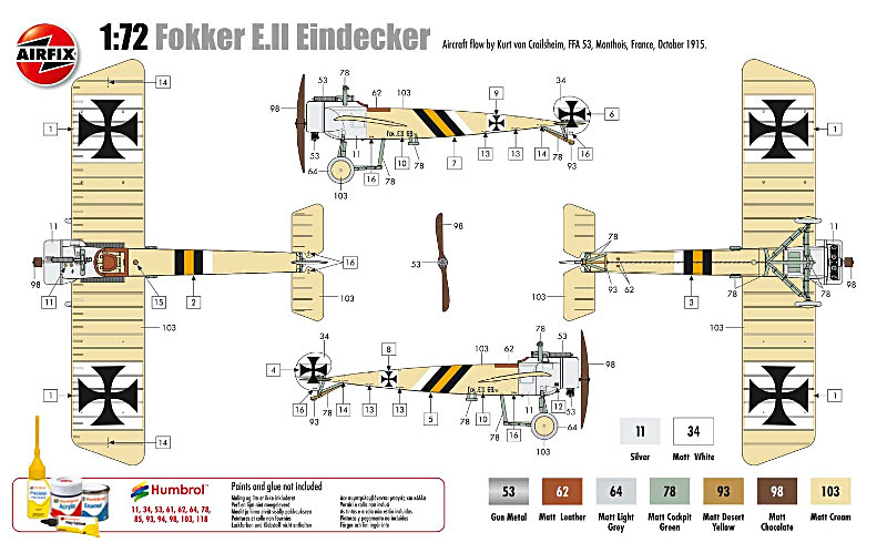 Bemalungsvarianten: Der Decalbogen für eine Gestaltungsvariante ist tadellos auf hellblauem Trägerpapier gedruckt. Die Farbvorlage befindet sich auf der Schachtelrückseite. Als Farben werden die von Humbrol empfohlen.