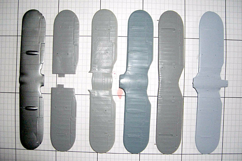 Die Form der oberen Tragfläche ist identisch, nur Hobby Boss und Airfix haben bei der Spannweite 1 mm zugelegt. Gleiches gilt für die unteren Tragflächen. Diese unterscheiden sich vor allem in der Art der Verbindung zum Rumpf. Revell liefert als einziger eine geteilte Fläche. Der Hinterkantenübergang zum Rumpf ist bei hier und Hobby Boss zu rund. Die untere Fläche hat bei Sword, Hobby Boss und Airfix bereits den entsprechenden Winkel und erleichtert dadurch die weiter Montage. Bei allen gibt es Montagehilfen für die Baldachinstreben. Bei den äußeren Revell, Hobby Boss und Airfix. Alle bedürfen aber etwas Nacharbeit.