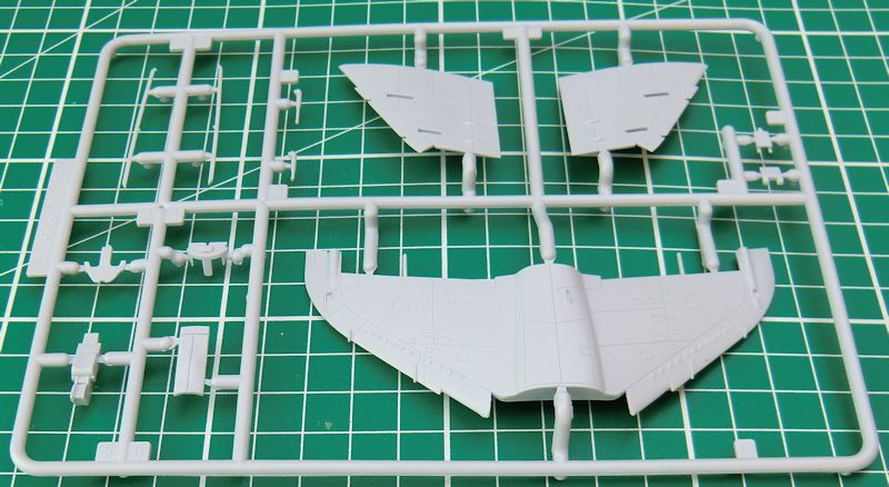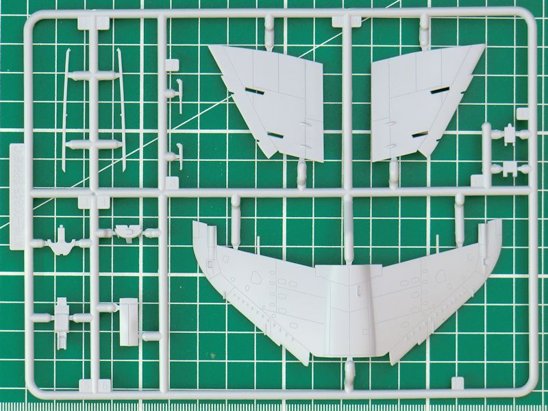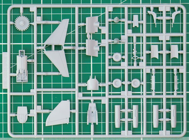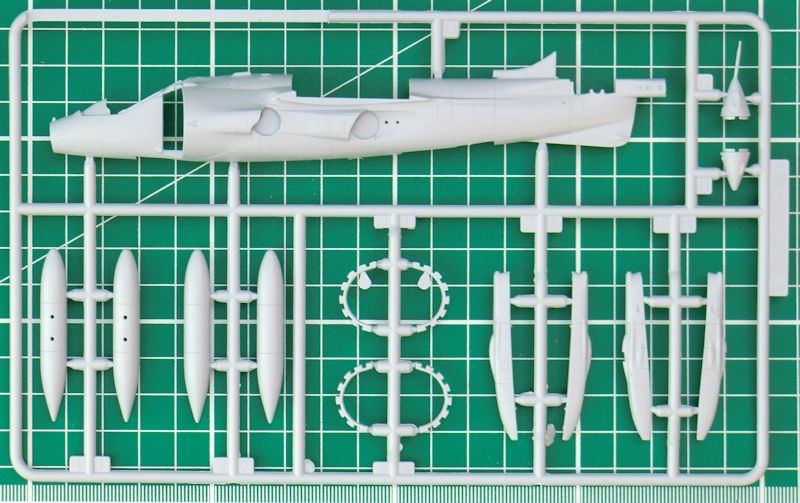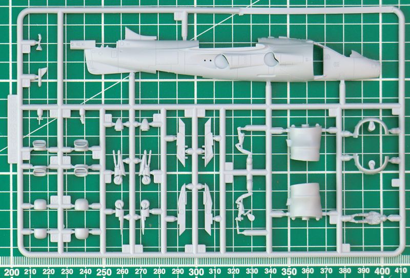 Betrachtet man die Bauteile, dann kommt bei mir einfach Freude auf. Es gibt schöne versenkte Strukturen, die sehr fein sind, und pfiffige Lösungen im Detail. Bewundert habe ich auch die Triebwerksschaufeln, die im Innern des Rumpfes fast verschwinden. Klar erkennt man: Dieser Bausatz wurde für den Einsteiger entwickelt. Die Winkel von Tragfläche und Höhenleitwerk sind durch die Bauteile fixiert. Es gibt überall scharfe Hinterkanten. Modellbauer was willst Du mehr? Die meisten Bauteile sind aus den britischen GR. 1 und 3-Bausätzen bekannt. Nur ein kleiner Spritzling wurde neu entwickelt. Er enthält die speziellen USMC-Modifikationen.