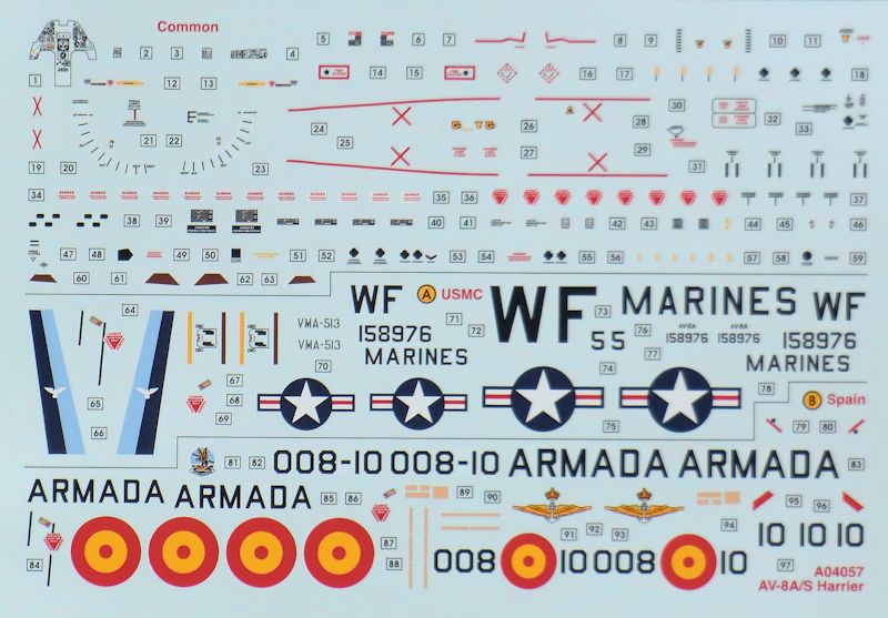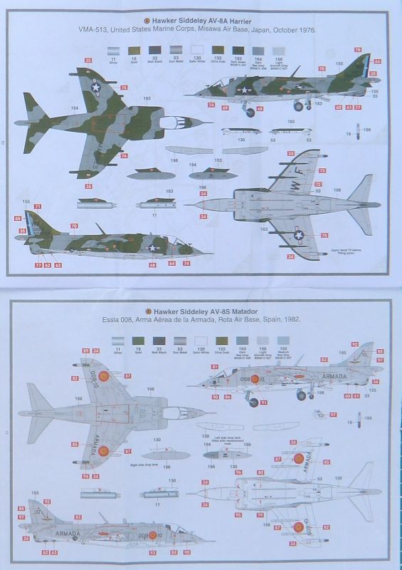 Der Decalbogen ist eine Augenweide! Hier gibt es wohl alles an Wartungshinweisen, die jemals am AV-8A Harrier angebracht waren. Der Druck auf hellblauem Trägerpapier ist tadellos. Die Farbhinweise sind für das System von Humbrol. Etwas zum Meckern habe ich doch mal. Airfix sollte die Spritzlinge mal in der Bauanleitung abbilden und auch zeigen, welche Teile nicht benötigt werden. Schön ist dafür wieder die mehrfarbige Bemalungsanleitung.