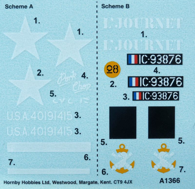 Bauanleitung/Bemalung:Die 20-seitige Bauanleitung führt in 32 Baustufen zum fertigen Modell. Die Farbangaben sowie Decals beziehen sich auf eine US-Version im Winter 1944/45 sowie eine Französische in Indochina Juli 1953. Die Farbnummern sind ausschließlich auf das Sortiment von Humbrol bezogen.