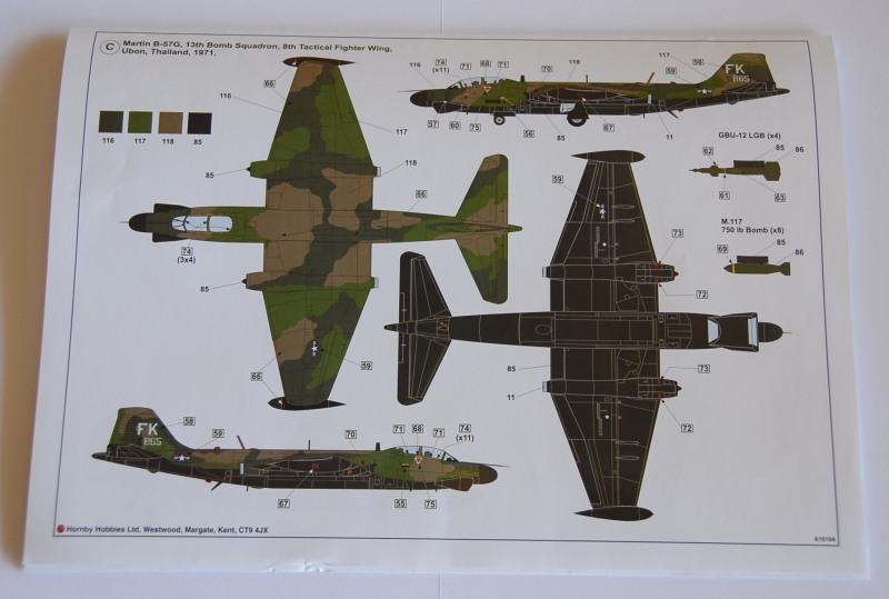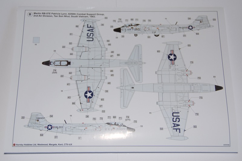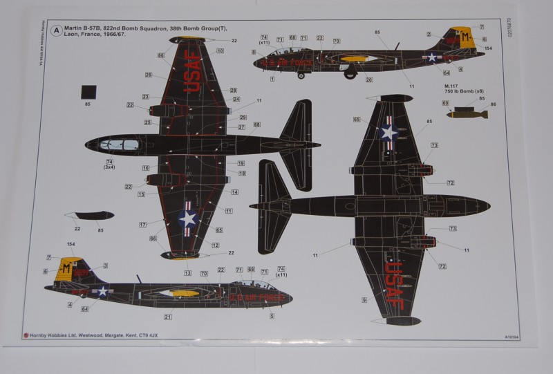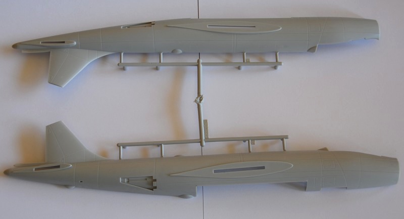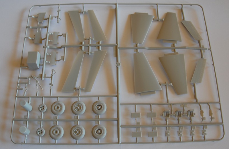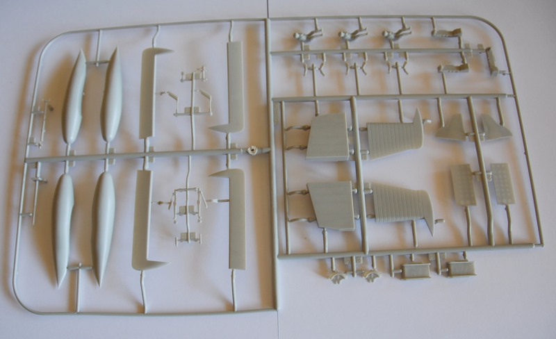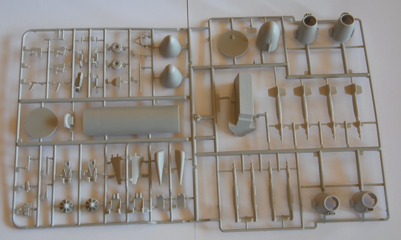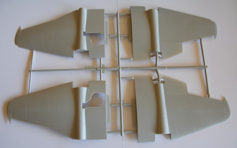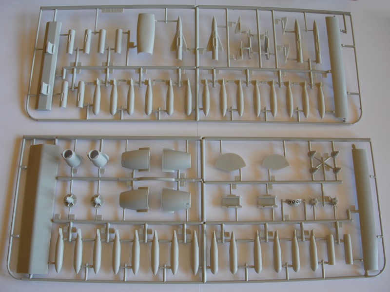 Der Rumpf: Der Rumpf besteht aus 2 großen Rumpfhälften und man hat die Wahl 3 verschiedene Bugnasen, zur jeweiligen Version passend, anzubauen. In der Baugruppe 6 wird gezeigt wie alles zusammengehört, jedoch erfährt man erst in der Baugruppe 31 dass man die Wahl hat den Bombenschacht offen oder geschlossen darzustellen. Da jedoch der Bombenschacht und die „Bombenklappen“ (wie im Original) aus EINEM Teil bestehen ist es für eine Entscheidung, wenn man sich strikt an die Bauanleitung hält, zu spät. Zu diesem Umstand führt auch die Tatsache dass Teile vorhanden sind die für andere Varianten gedacht sind (und den Bombenklappen ähnlich sind) und überhaupt nicht gebraucht werden um eine von 3 Versionen aus diesem Kasten zu bauen. Damit die Maschine nicht hecklastig wird ist in der Bauanleitung ein Gewicht von 100g angegeben welches in die Bugnase wandert. Ich würde das überprüfen, da ich einen Artikel in einer englischen Modellbauzeitschrift gelesen habe in der das Gewicht nicht ausgereicht hat und der Modellbauer die Triebwerke zusätzlich „verbleit“ hat. Der darin beschriebene Bausatz war zwar von Classic Airframes, aber die Geometrie ist ja die gleiche! Das Höhenleitwerk muss geändert werden. Auf den Einzelteilen sind Gravuren vorhanden die ich auf keinem Vorbildfoto entdecken konnte. Hier hilft nur das Studium von Literatur.