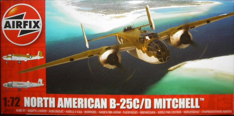 Bausatz: B-25 Bausätze gibt es seit Anfang des Plastikmodellbaus. Fast jeder bekannte Hersteller (FROG, REVELL, AIRFIX) hatte einen Bausatz der ersten Generation im Programm. Später folgte ITALERI und MATCHBOX. Einen richtig guten Bausatz gab es dann erst vor einigen Jahren von HASEGAWA, aber dieser war auch recht teuer. Nun folgt AIRFIX mit einem Bausatz, der nach neuesten Formenbautechniken hergestellt ist.