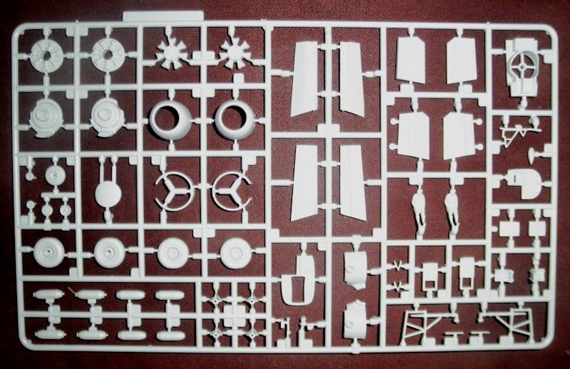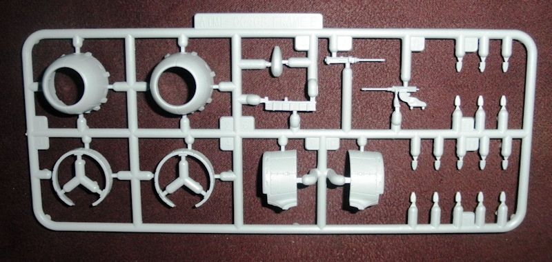 An den nächsten großen Spritzrahmen sind folgende Teile: abgeflachte Räder, Fahrwerksbeine, zwei Piloten, zwei Sitze, vier Bomben, Armaturentafel, MG-Stand, die Sternmotoren [zwei vollständige Sterne, zwei Platten mit halben Sternen], Seitenleitwerk und Fahrwerksklappen.