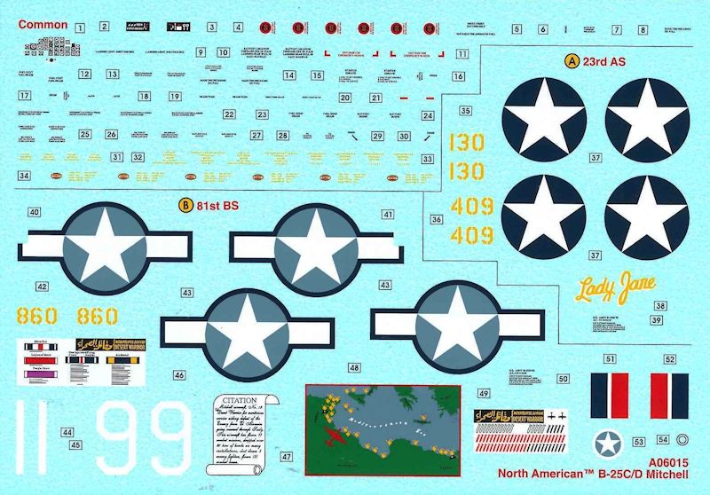 Bemalung: Der Abziehbilderbogen ist sauber und versatzfrei auf blauen Papier gedruckt und enthält alle nötigen Wartungshinweise, das Instrumentenbrett, Funkgerät und die Möglichkeit zwei verschiedene B-25 der US Air Force darzustellen. Die B-25 LADY JANE der 23. Staffel und die B-25 DESSERT WARRIOR der 81. Bomberstaffel mit großen Nose Art.