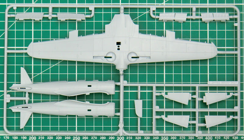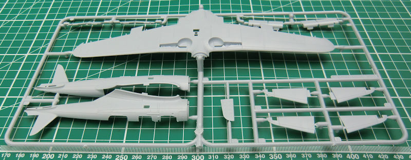 In dem attraktiven praktischen Stülpkarton befinden sich gut verpackt fünf hellgraue Spritzgussrahmen mit 97 Teilen, einen Klarsichtrahmen mit sieben Teilen, ein Decalbogen und die typische mehrfarbige Bauanleitung. Die Bauteile machen einen sehr zeitgemäßen Eindruck. Die Strukturen sind noch feiner geworden und die Aufteilung der Bauteile hat man bei Airfix neu gelöst. So befinden sich Teile des Cockpits auf der oberen Tragflächenhälfte.