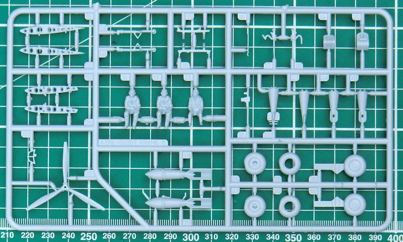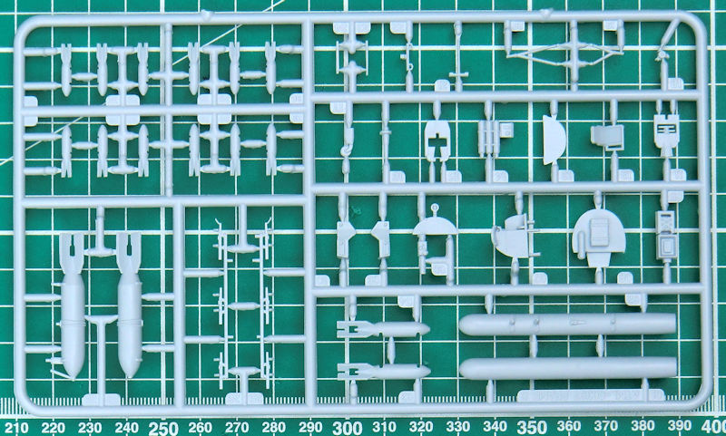 Der Motor entsteht aus drei Teilen. Da es einen separaten Spritzling für die Motorsektion gibt, ist schon klar, dass es 2016 eine B5N1 geben wird. Die Kühlluftklappen an der Motorhauben können offen oder geschlossen sein. Dafür liefert Airfix ein Alternativteil. Die Hauptfahrwerksräder sind leicht abgeflacht. Das Fahrwerk und die Schächte sehen aus dem Kasten heraus sehr gut aus. Bei den Abwurfwaffen hat Airfix geklotzt. Hier gibt es diverse Optionen. Die Klarsichtteile sehen sehr gut aus. Daher kann auch die Kanzel alternativ offen oder geschlossen bleiben. Für die erstere Position hat man die Teile zusammengefasst. Damit muss man die offenen Teile nicht über die festen würgen…