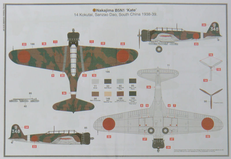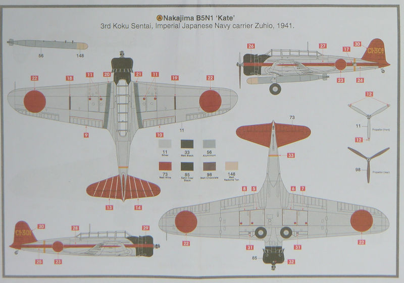 Vorbild: Die Nakajima B5N mit dem alliierten Codenamen "Kate" war der Standarttorpedobomber der kaiserlichen japanischen Marine im WK II. Zu Beginn der Kampfhandlungen 1941 war sie den alliierten Mustern deutlich überlegen. Sie wurde erfolgreich über Pear Harbor und in den Kämpfen im Korallenmeer und um Midway eingesetzt. Geflogen wurde die B5N von drei Mann.