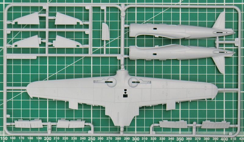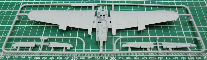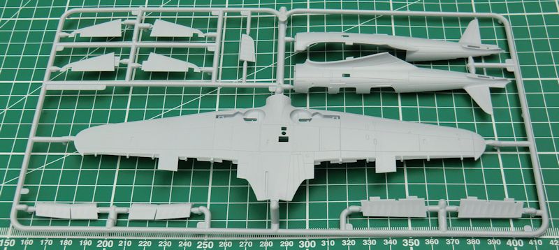 In dem attraktiven praktischen Stülpkarton befinden sich gut verpackt fünf hellgraue Spritzgussrahmen mit 97 Teilen, einen Klarsichtrahmen mit sieben Teilen, ein Decalbogen und die typische mehrfarbige Bauanleitung. Die Bauteile machen einen sehr zeitgemäßen Eindruck. Die Strukturen sind noch feiner geworden und die Aufteilung der Bauteile hat man bei Airfix neu gelöst. So befinden sich Teile des Cockpits auf der oberen Tragflächenhälfte.