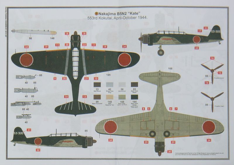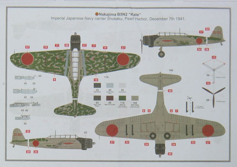 Vorbild: Die Nakajima B5N mit dem alliierten Codenamen "Kate" war der Standarttorpedobomber der kaiserlichen japanischen Marine im WK II. Zu Beginn der Kampfhandlungen 1941 war sie den alliierten Mustern deutlich überlegen. Sie wurde erfolgreich über Pear Harbor und in den Kämpfen im Korallenmeer und um Midway eingesetzt. Geflogen wurde die B5N von drei Mann.