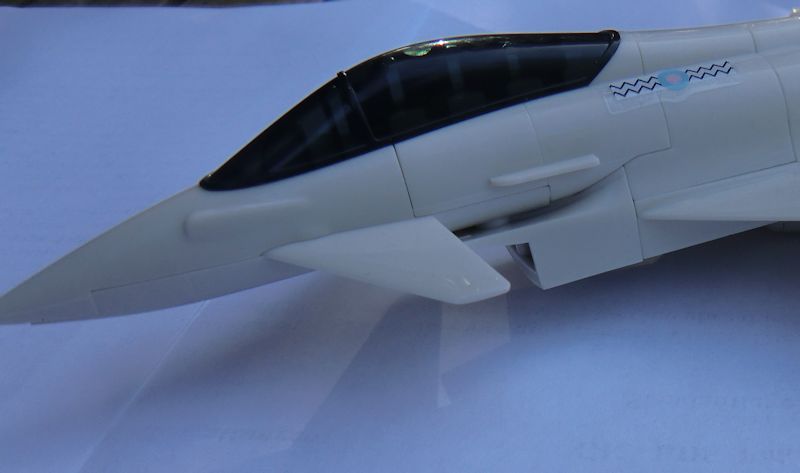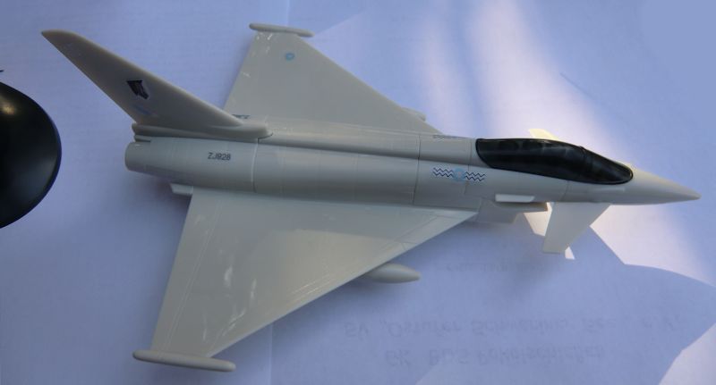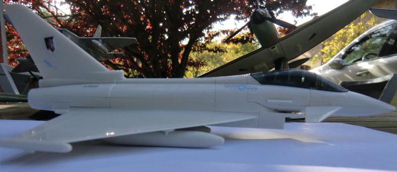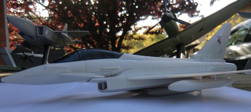 Mein Plan war, alle 6 Bausätze an einem Abend locker mal zusammen zu bauen. Aber ich habe dazugelernt., und es dauerte 3 Abende, bis alle Bausätze fertig waren. Beim Eurofighter kann statt des Ständers optional ein Zusatztank montiert werden.