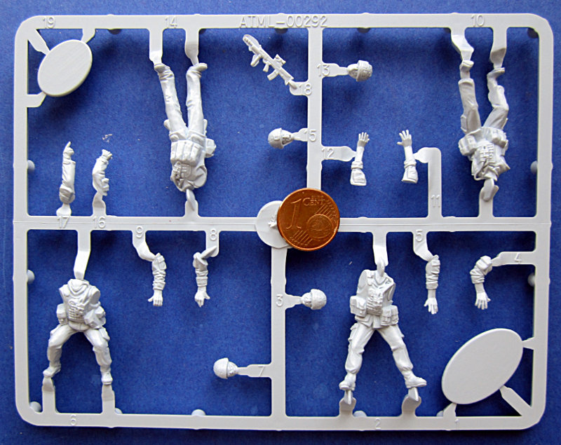 Die Bikes sind von bekannter Qualität. Der Guss ist gut und die Detaillierung ist ebenfalls in Ordnung. Wie auch bei Tamiya bemühen sich die Designer um einen einfachen Aufbau, ganz im Sinne der neu einsteigenden Modellbauer. Die Räder sind zweiteilig und treffen hier das Vorbild recht gut (im Gegensatz zu den Landrovern und Jackal/Coyote). Auch die Figuren sind recht ansprechend, obwohl mir die Gesichter nicht so besonders gefallen. Allerdings ist das Thema Figuren bemalen ohnehin ein rotes Tuch für mich. Immerhin gibt es einen sitzenden Fahrer und drei stehende Soldaten in unterschiedlichen Posen.