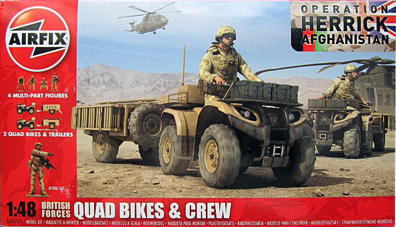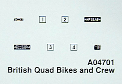 Als vorerst vorletzter Bausatz (für 2014 ist derzeit nichts Neues angekündigt) dieser Linie ist die Quadkombination mit Besatzung erschienen. Im Bausatz befinden sich zwei identischen Spritzrahmen für die Yamaha ATVs mit Logic Anhängern und ein kleinerer Gießast mit 4 Figuren.