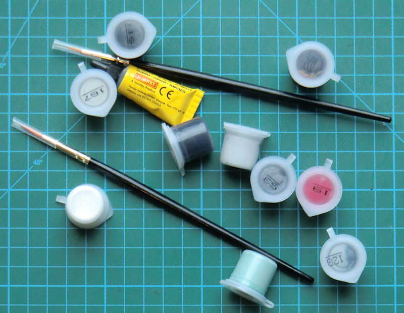 Der Decalbogen ist tadellos gedruckt. Die Farbangaben sind für das Humbrol-Farbsystem. Ein paar kleine Döschen Acrylfarben liegen dem Bausatz ja bei.