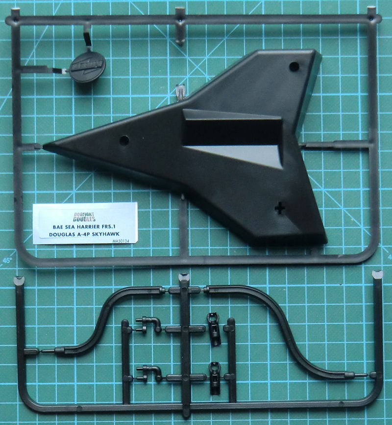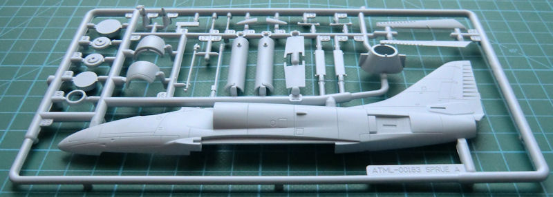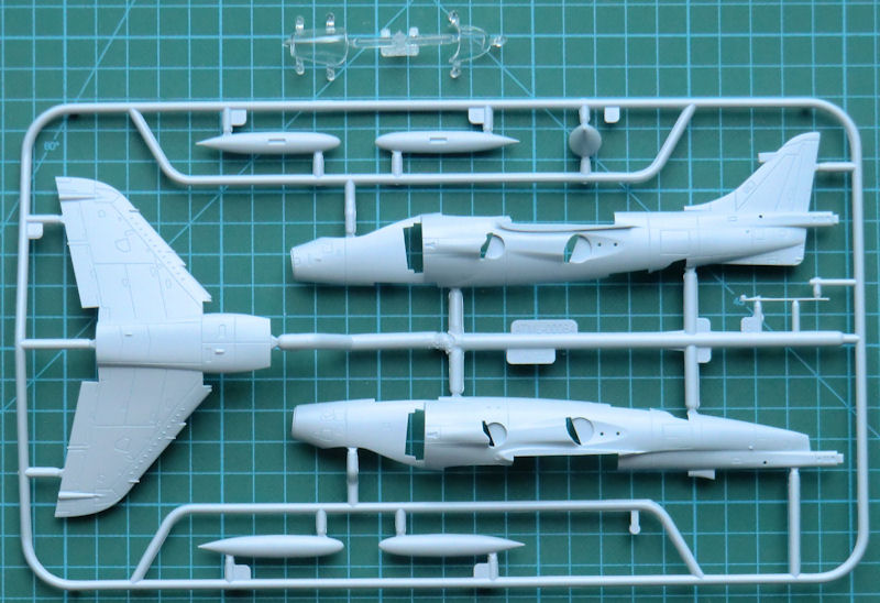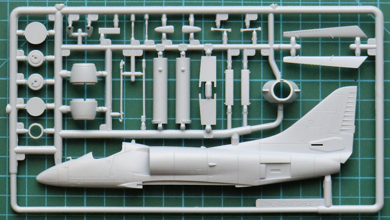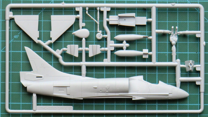 Die Douglas A-4P in 1/72 war eine Neuheit des Jahres 2012 und wurde komplett neu entwickelt. Dieser Bausatz besteht aus drei hellgrauen Spritzlingen mit 65 Teilen und zwei Klarsichtteile. Den Decalbogen teilt sich die Skyhawk mit dem Harrier.