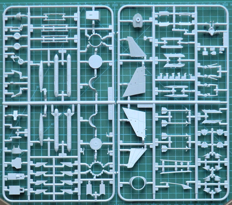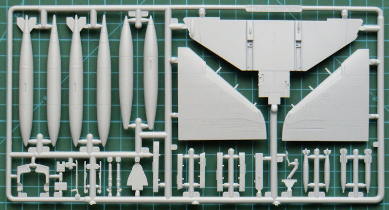 Die Lufteinläufe sind schön tief und interessant konstruiert. Das gilt auch für den Triebwerksauslass. Mir gefällt die Konstruktion der Tragfläche. Diese besteht aus einem unteren Teil und zwei obere Teile. Die Hinterkanten sind scharf. Das gilt auch für die beiden Hälften des Höhenleitwerks und selbst beim Seitenleitwerk gibt es einen scharfen Abschluss. Airfix liefert auch separaten Vorflügel mit. Optional können die Luftbremsen am Heck offen angebaut werden. Unter der Tragfläche kann man ein paar Bombennachbildungen und zwei Zusatztanks befestigen.