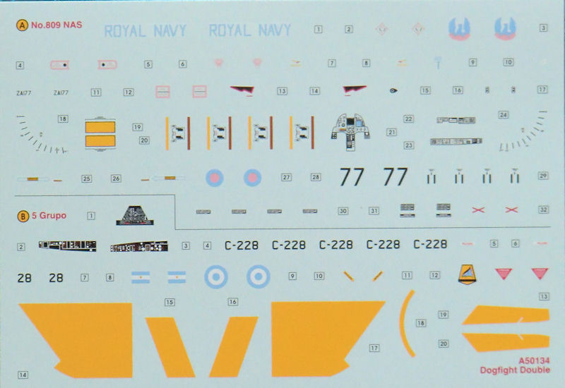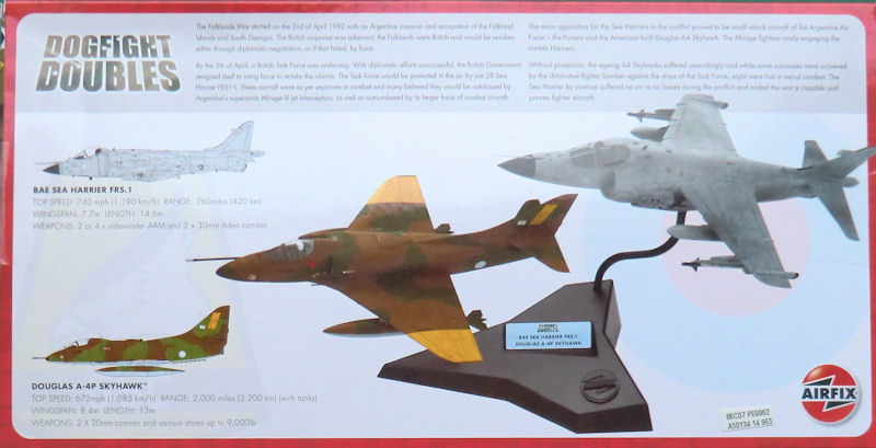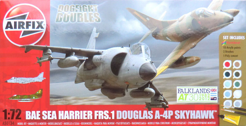 Bausatz: In diesem stabilen Karton befinden sich eine BAe Sea Harrier FRS. 1, eine Douglas A-4P und zwei Pinsel, dieverse Farben, Kleber, einem Ständer für eine dynamische Präsentation der Modelle sowie die Bauanleitung und ein Decalbogen.