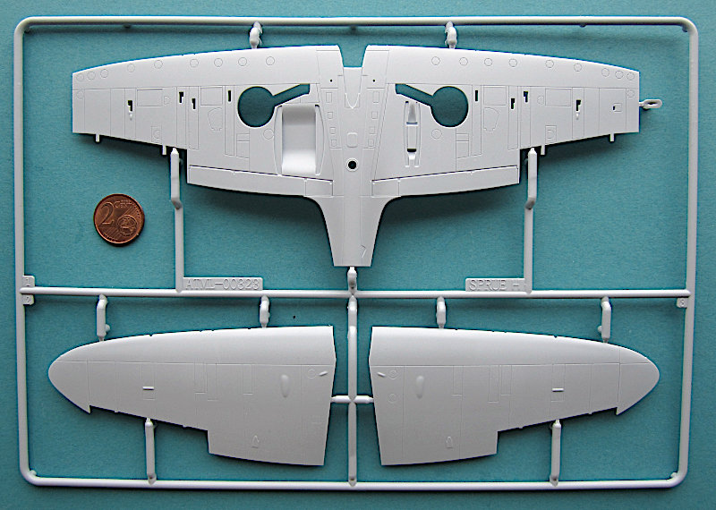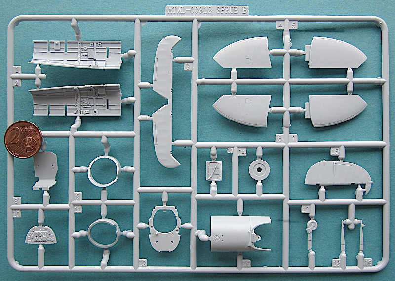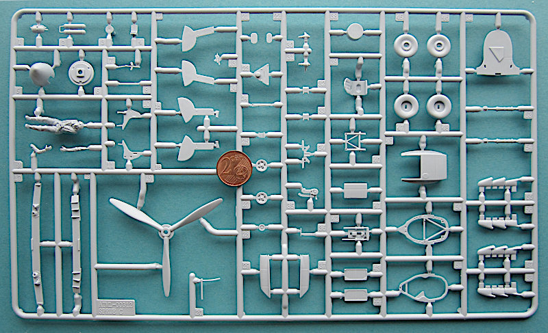 Zunächst fällt nach dem Öffnen der sehr helle vergleichsweise weiche Kunststoff auf. Die Gravuren sind scharf und tief, allerdings gibt es einige leichte Sinkstellen, zum Beispiel am Rumpf wo sich auf der Innenseite die beiden Spanten befinden. Die Aufteilung des Cockpits war seinerzeit wegweisend und wird von den anderen Herstellern ähnlich gehandhabt. Wer wie genau damit angefangen hat weiß ich nicht mehr, diese Innenschalen erleichtern jedoch den Austausch gegen ein Resincockpit oder wie hier im Bausatz die Beigabe zweier verschiedener rechter Cockpithälften.
