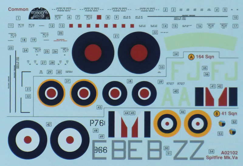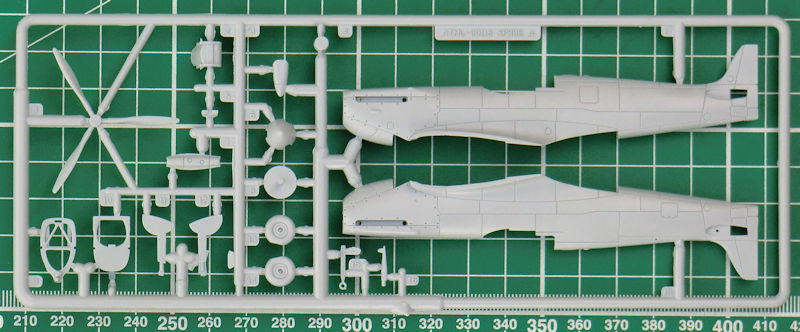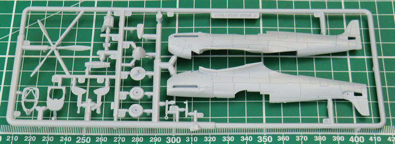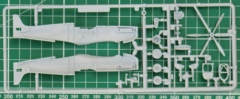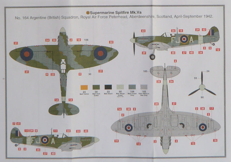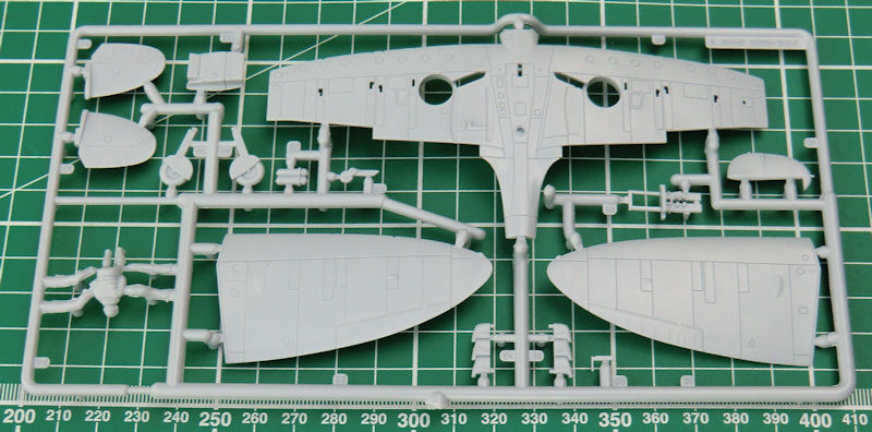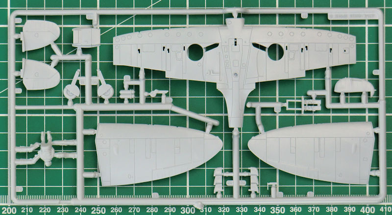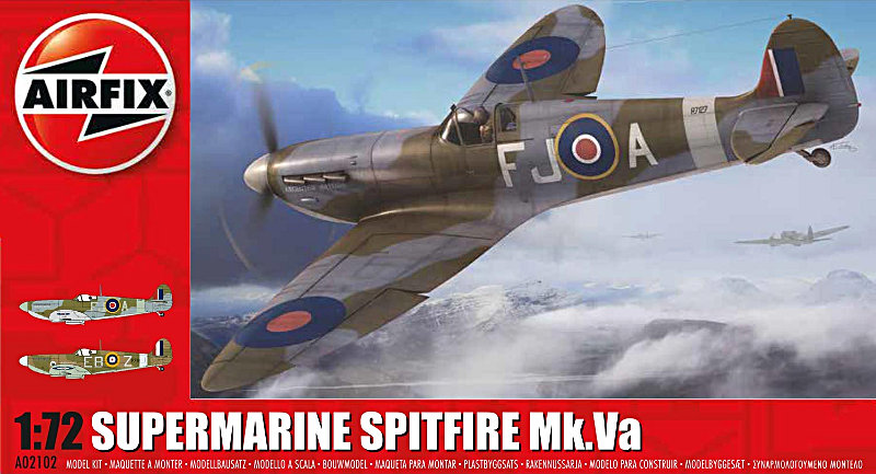 Bausatz: Airfix hatte seit vielen Jahren im Maßstab 1/72 eine recht brauchbare Supermarine Spitfire Mk. V im Angebot. Allerdings war dieser Bausatz nicht mehr ganz zeitgemäß. 2010 gab es eine frühe Mk. Ia und nun folgt dieser Bausatz leicht modifiziert als Mk. Va auf dem Markt. In dem praktischen attraktiven Stülpkarton befinden sich gut verpackt drei hellgraue Spritzlinge mit 42 Teilen, zwei Klarsichtkanzeln, ein Decalbogen und die mehrfarbige Bau- und Bemalungsanleitung. Der kleine Spritzling mit den beiden unterschiedlichen Luftschrauben wurde hinzugefügt und neu ist auch die zweite spätere Klarsichtkanzel.