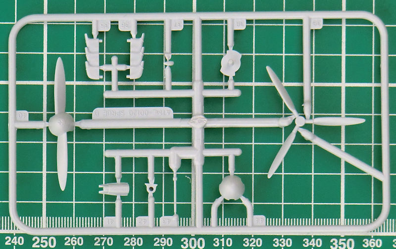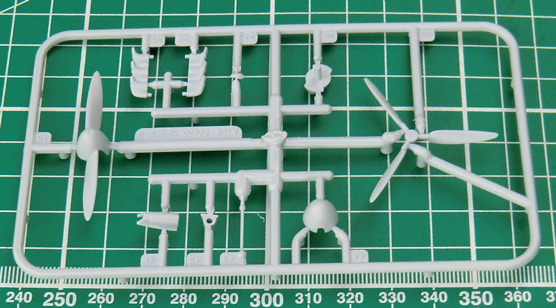 Das Cockpit besteht aus fünf Bauteilen und der obligatorischen Pilotenfigur. Also eine gute Grundlage. Weiterhin sind die Rumpfinnenseiten gut strukturiert. Leider sind die beiden Kanzeln nur einteilig. In diesem Bausatz findet man nun auch drei verschiedene Luftschrauben und zwei verschiedene Auspuffleisten.