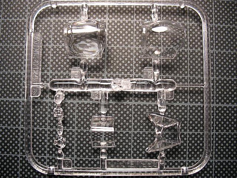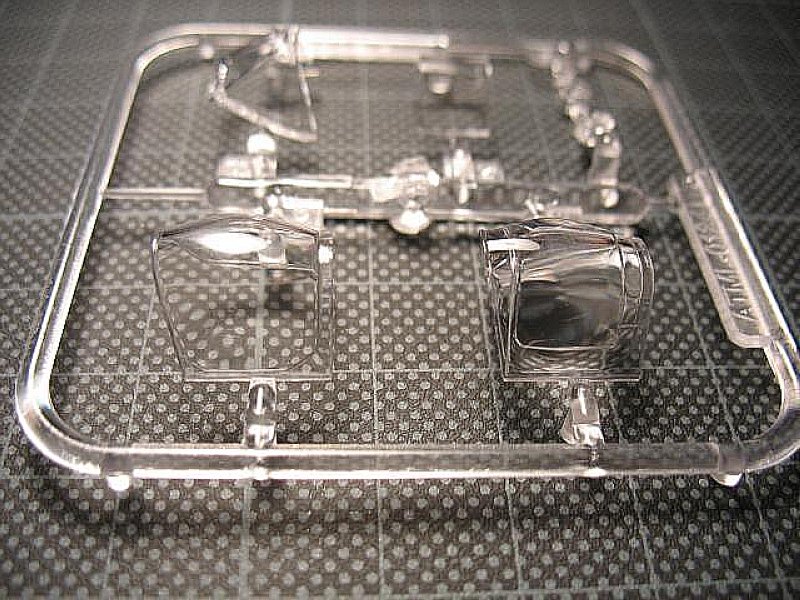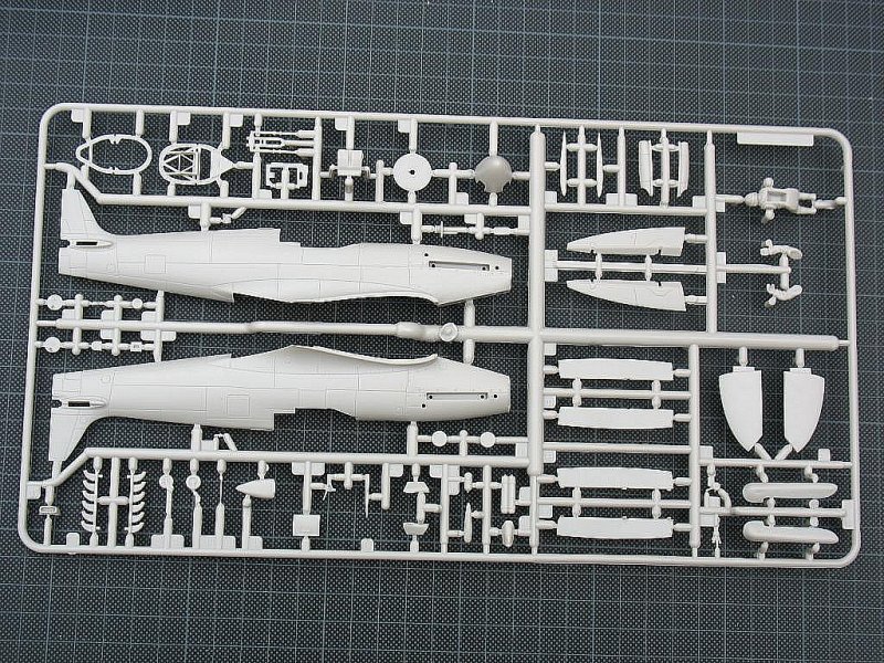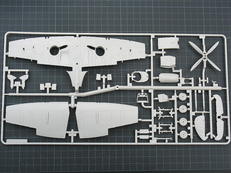 Innen finden sich sechs recht feine, aber nicht ganz schlierenfreie Klarsichtteile, sowie an zwei Spritzrahmen wechselnder Stärke (nach meiner Zählung) 95 hellgraue Bauteile mit leicht rauer Oberfläche und relativ feinen Gravuren. Glaubt man den Rezensoren anderer Internetforen, so sind die Gravuren feiner als bei den bisherigen Spitfire-Modellen dieser Serie. Das Plastik ist recht dick, aber nicht zu weich, so dass es sich gut bearbeiten lassen sollte. Die Spritzkanäle sind teils sehr kurz, so dass manche Teile nur schwer ohne Bruch abzutrennen sein dürften. Gussgrate sind nicht zu finden, ebenso fehlen Sinkstellen, einzig ein paar sehr flache Auswerfermarkierungen lassen sich nachweisen. Letztere liegen jedoch, abgesehen von den Querrudern, in später nicht einsehbaren Bereichen.