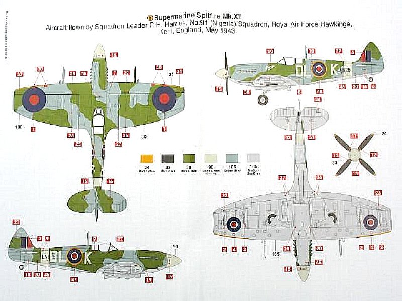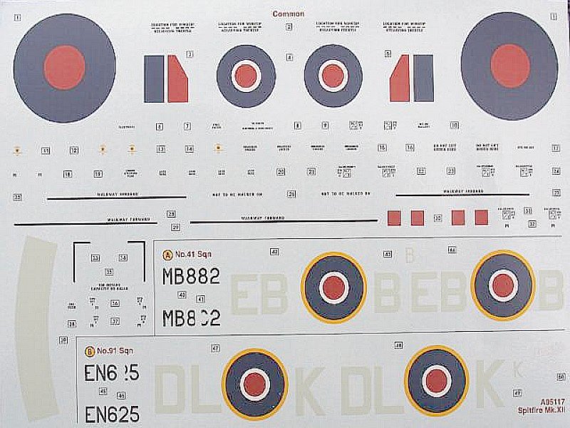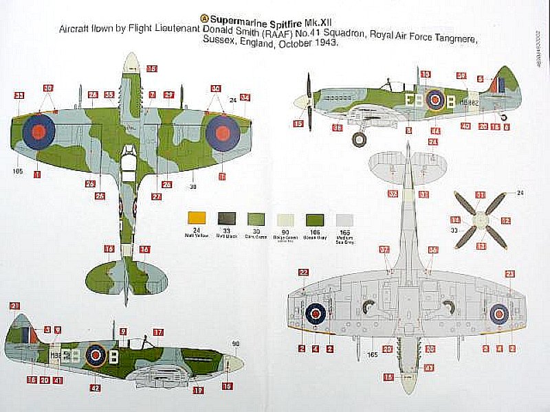 Decals liegen für die Maschine von Flight Lieutenant Donald Smith (RAAF), No 41st Squadron, RAF Tangmere, Sussex, Oktober 1943 und die von Squadron Leader R.H. Harries, No 91st (Nigeria) Squadron, RAF Hawkinge, Kent Mai 1943 bei, beide Maschinen sind in Ocean Grey, Dark Green und Medium Sea Grey getarnt mit Spinnern und Rumpfbändern in Sky. Die Bemalungsanleitungen finden sich auf einem farbigen, zweiseitigen DIN A4-Hochglanzblatt. Dabei beziehen sich die Farbbezeichnungen auf das Humbrol-System.