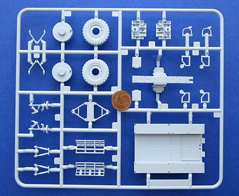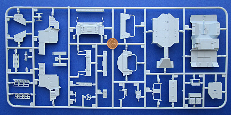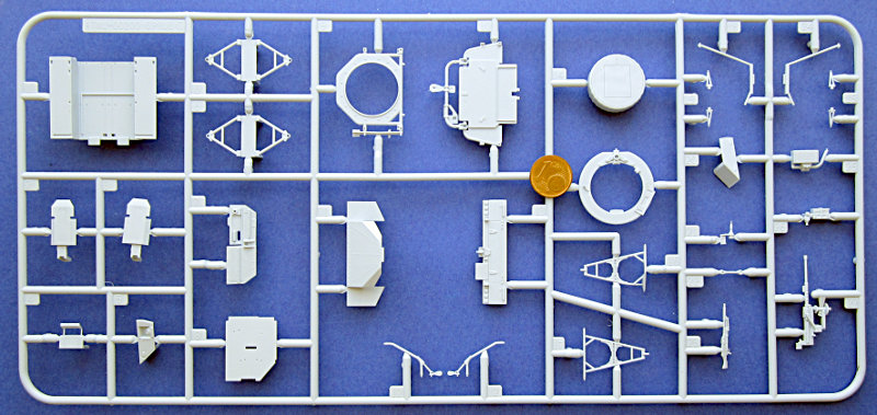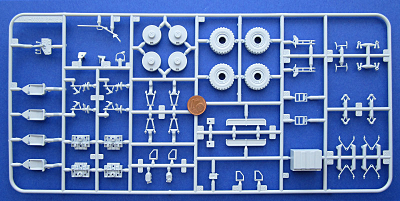 Doch der Reihe nach beginnen wir mit dem Bausatz. Dieser präsentiert sich in typischer Airfixmanier in hellgrauem Kunststoff. Die Teile sind teils recht stark vereinfacht (z.B. die Räder) was jedoch einer zügigen Fertigstellung des Modells aus dem Kasten entgegenkommt. Trotzdem enthält der Bausatz 3 große und einen mittleren Gießrahmen, so dass man sich auf eine Menge Bastelspaß freuen kann. Persönlich war mir das etwas zu einfach, weshalb ich auf das Zubehör gewartet habe.