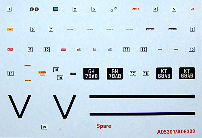 Die Bauanleitung zeigt ein sandgelbes Fahrzeug aus dem Afghanistan-Einsatz (Operation Herrick) der kleine Decalbogen enthält aber ein weiteres paar Nummernschilder. Mir ist nicht bekannt, dass es irgendwelche Decalsätze auf dem Zubehörmarkt gibt.