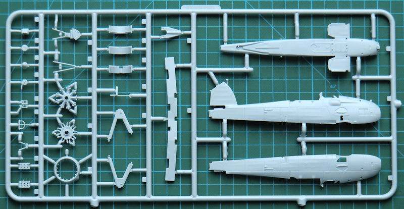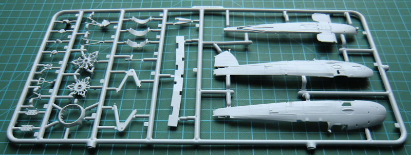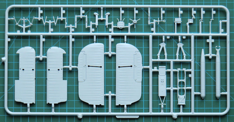 Für die Montage des Seitenruders liefert die Bauanleitung eine Skizze mit dem Hinweis auf den maximalen Einschlagwinkel. Das Ruder selbst besteht aus einem Stück und besitzt eine scharfe Hinterkante. Auch bei den Quer- und Höhenrudern liefert Airfix scharfe Hinterkanten. An den Tragflächenunterseiten kann man leider außen die Sacklöcher für die Bombenhalterungen erkennen. Neben den kleinen Bomben gibt es natürlich auch den Torpedo und einen Zusatztank. Für den Torpedo gibt es auch einen Karren für den Bodentransport.