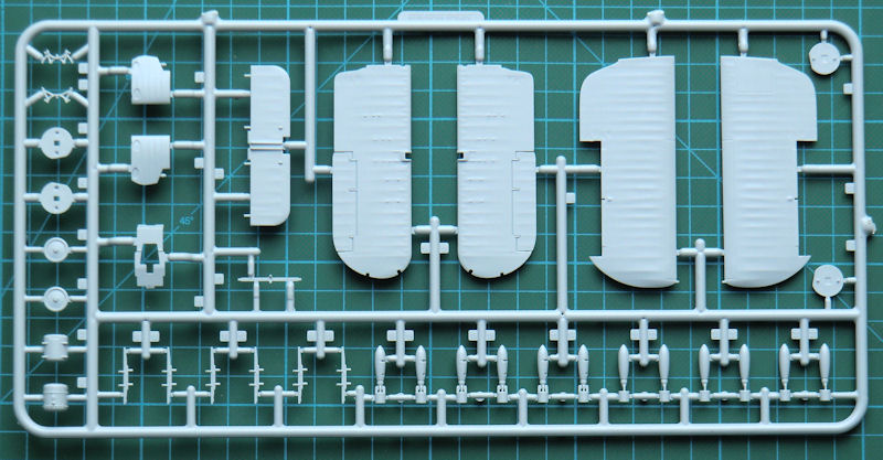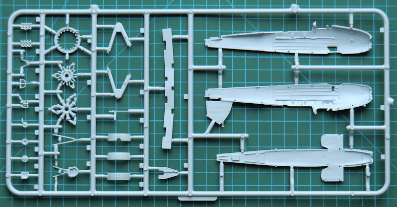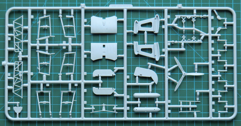 In dem attraktiven praktischen Stülpkarton befinden sich gut verpackt vier hellgraue Spritzlinge mit 120 Einzelteilen, ein Klarsichtrahmen mit fünf Teilen, ein Decalbogen und eine gut gemachte Bauanleitung mit einer mehrfarbigen Bemalungsanleitung. Die gelieferten Bauteile haben schöne Strukturen und bei der Stoffbespannung wurde mit viel Sorgfalt ein realistische Effekt nachgebildet. Innen hat der Rumpf schöne Strukturen. Diese sind auch durch das offene Cockpit gut einsehbar. Zusätzlich entsteht aus einem Gerüst noch eine eigene Baugruppe, die dann in den Rumpf eingesetzt wird. Die beiden Sitzgelegenheiten können auf jeden Fall noch Sitzgurte vertragen. Für das Instrumentenbrett gibt es ein Decal.