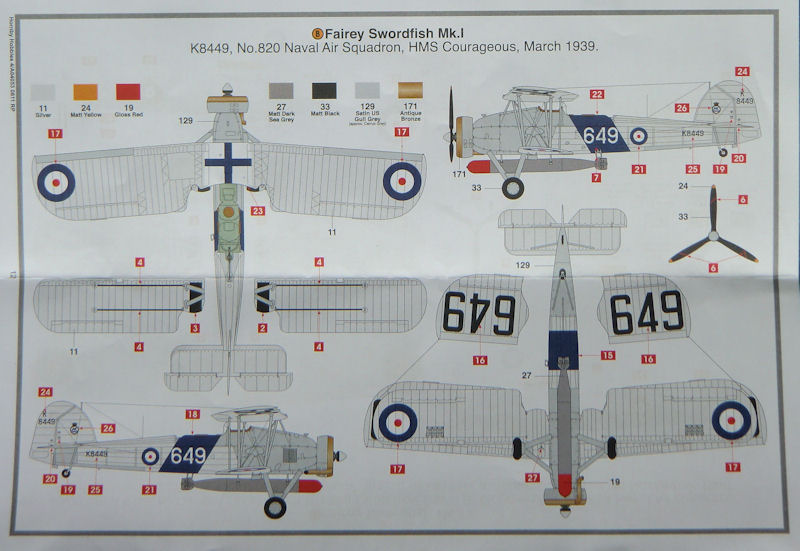 Die Dcals sind tadellos ohne Versatz auf hellblauem Trägerpapier bei Catograf gedruckt. Leider liefert die Bauanleitung keinen Verspannungsplan. Die Farbangaben sind für das Humbrol-Farbsystem.