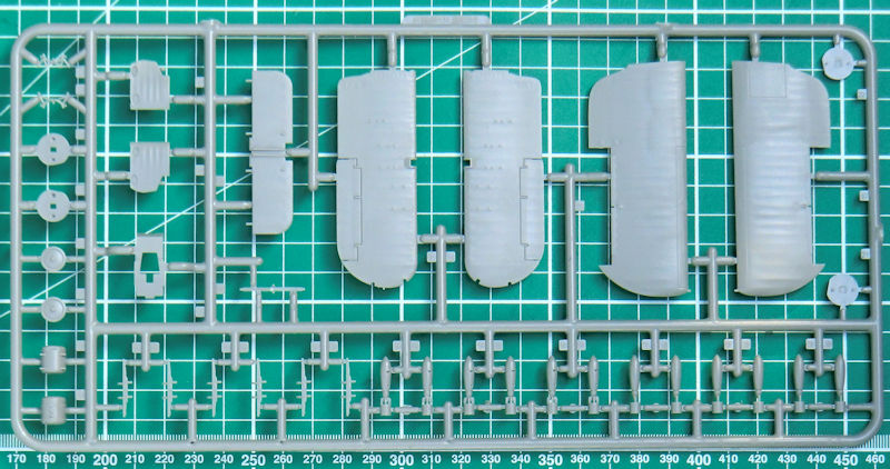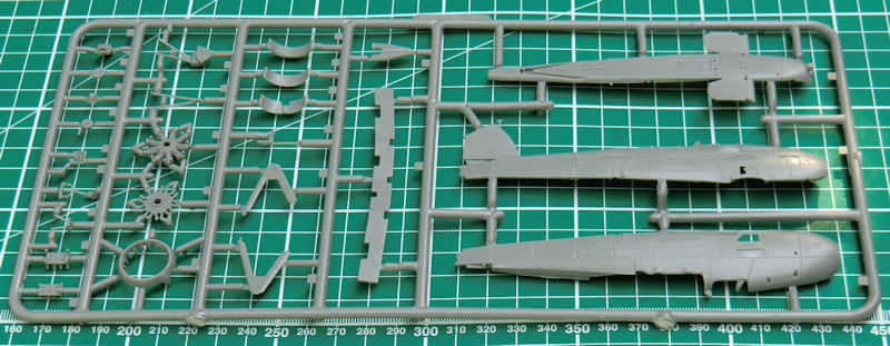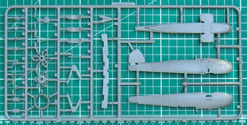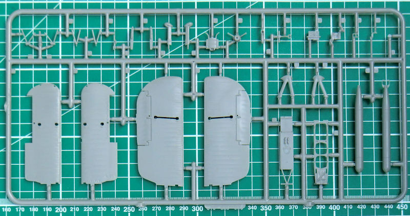 Für die Montage des Seitenruders liefert die Bauanleitung eine Skizze mit dem Hinweis auf den maximalen Einschlagwinkel. Das Ruder selbst besteht aus einem Stück und besitzt eine scharfe Hinterkante. Auch bei den Quer- und Höhenrudern liefert Airfix scharfe Hinterkanten. An den Tragflächenunterseiten kann man leider außen die Sacklöcher für die Bombenhalterungen erkennen. Neben den kleinen Bomben gibt es natürlich auch den Torpedo und einen Zusatztank. Für den Torpedo gibt es auch einen Karren für den Bodentransport.