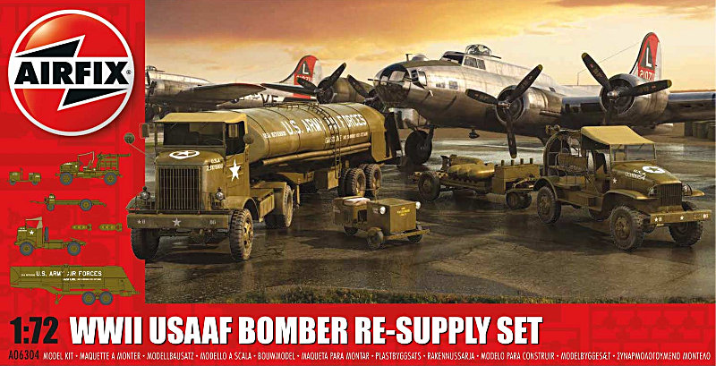 Hintergrund: Nach dem 2014 erschienen hervorragenden RAF Set im Maßstab 1:72, fieberte man dem für 2016 angekündigten USAAF Bomber Re-Supply Set 1:72 entgegen. Eine super Sache, nicht nur für Dioramenbauer des 2. Weltkrieges, sondern auch für den Koreakrieg, oder Luftwaffen in Asien und Südamerika. Folgende Fahrzeuge bzw. Zubehör ist in diesem Set enthalten: Autocar U-7144-T 4x4 Tankzug mit F1 Tank, Chevrolet M6 Bomben Service LKW, Cushman Model 39 Package car, M5 Bomben Anhänger, sowie 500 lb Bomben und 1000 lb Bomben.