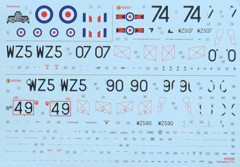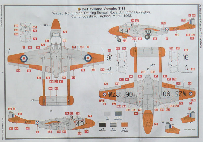 Mir gefallen die mehrfarbigen Bemalungsanleitungen mit den Farbangaben für das Humbrolfarbsystem. Der Decalbogen ist tadellos auf hellblauem Trägerpapier gedruckt. Für das Instrumentenbrett gibt es ein Decal und natürlich hat AIRFIX auch an die vielen Wartungshinweise und Warnmarkierungen gedacht.