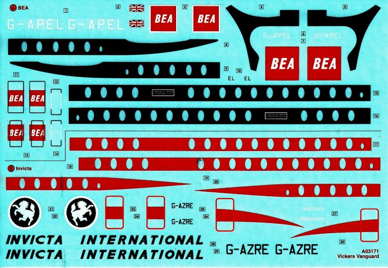 Es gibt die Nassschiebebilder für zwei Airlines, BEA und Invita International, wobei die Fenster offen gedruckt sind. Man kann nur hoffen, dass sie auf die Öffnungen der Fenster im Rumpf passen. Alle nötigen Decals sind dabei, um die Airlines darzustellen. Weitere Detaildecals gibt es nicht.